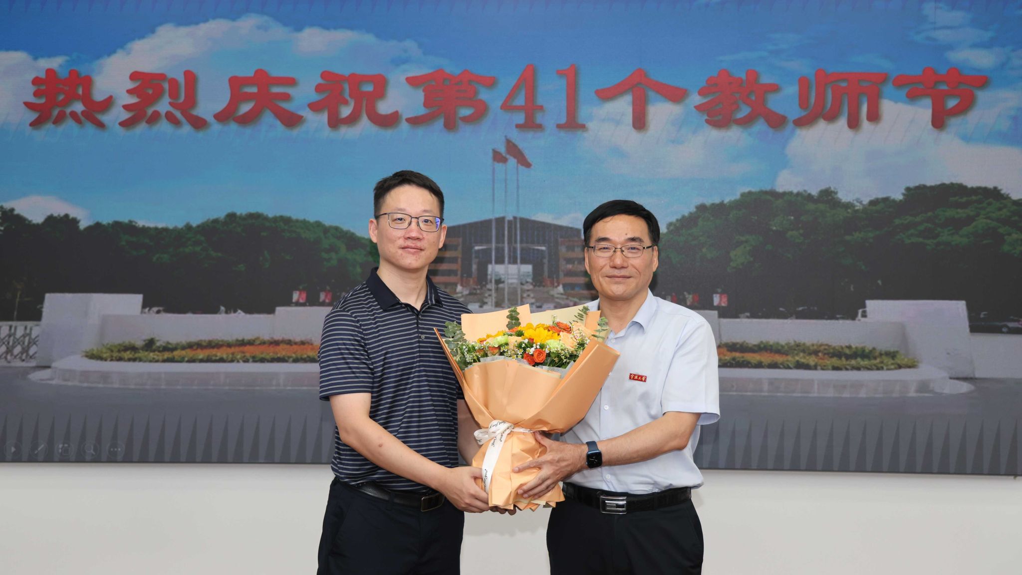 蔡荣根向教师代表们送上鲜花、致以节日的祝福,感谢他们为党的教育事业倾注心血、敬业奉献。他强调,人是一切的出发点,人才是学校最重要的战略资源。学校始终坚持“只要有利于学校发展的事情就要做”的原则,将人才工作作为一项常抓不懈的战略任务,努力为各类人才创造更好的工作环境和条件。他勉励广大教师要不忘立德树人初心,牢记为党育人、为国育才使命,争做“四有”好老师,为培养德智体美劳全面发展的社会主义建设者和接班人,推动学校事业高质量发展作出新的更大贡献。
