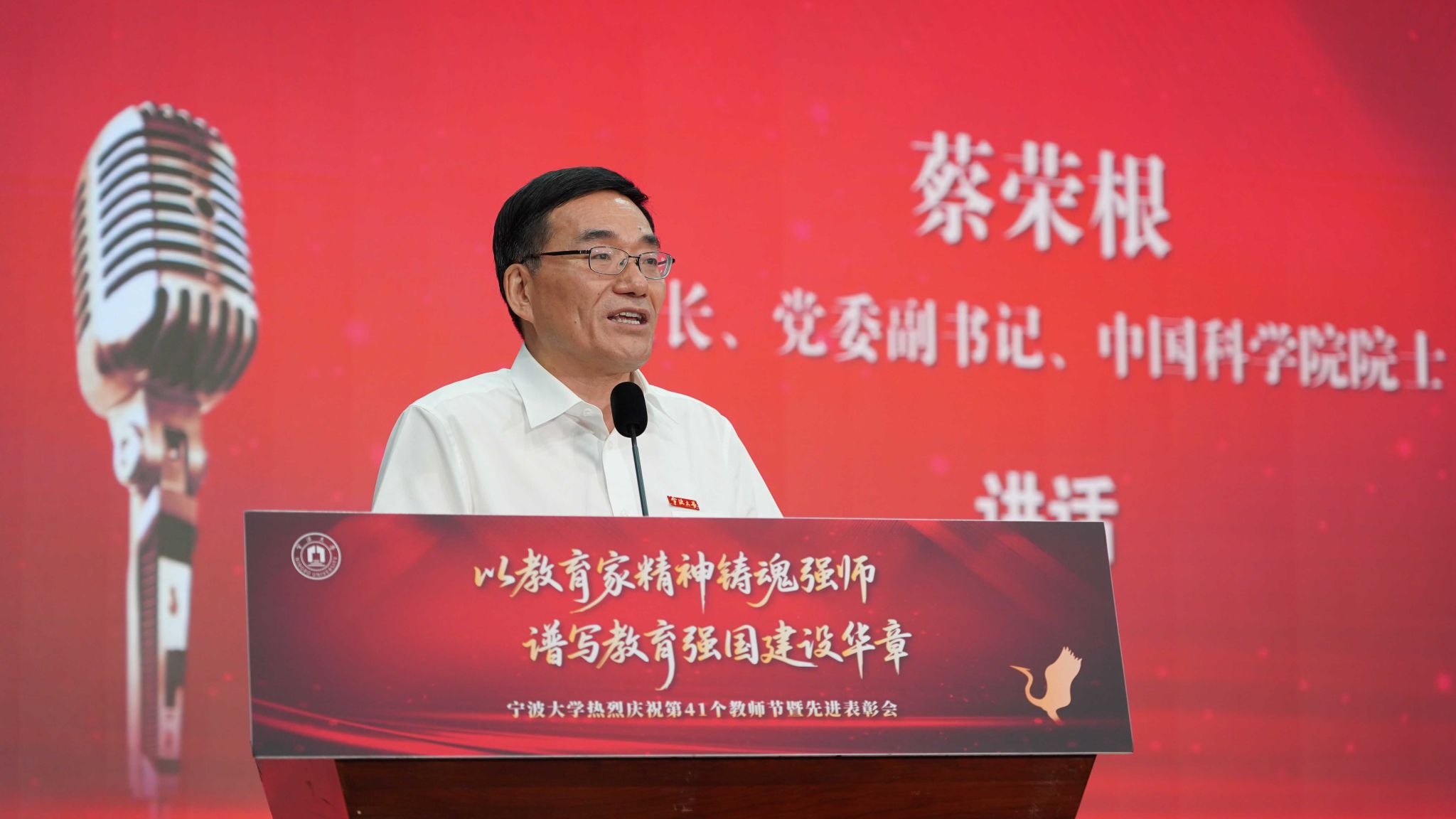 蔡荣根在讲话中向长期以来默默耕耘、辛勤工作的全体教职员工致以节日问候,向受到表彰的先进个人表示热烈祝贺,向新入职的教师们表示诚挚欢迎,向荣休的教师们表示崇高敬意!